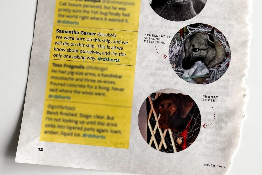 They made a hashtag for you to use in a tweet-length story, and winning entries would get published and receive a year’s subscription. I needed to win a subscription for my mother! And I did! She was very proud.