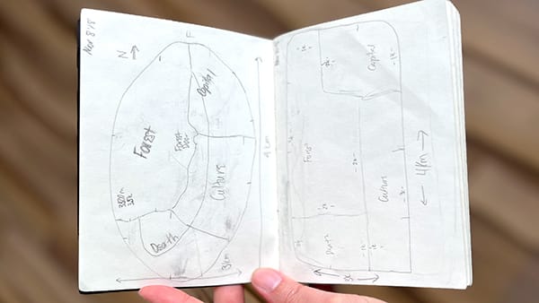 On November 8, 2018 I made my first sketches of the generation-ship, now called Ipswich [Ed. note: slightly less on the nose]. I’d envisioned it containing four quarters: Forest, Capital, Culture, and Death. Each one had their own distinct microculture. It was really fun to write, but here again I couldn’t realistically make this work in such a small and closed setting. Forest made it to the current Seeker of the Lost Song, though.